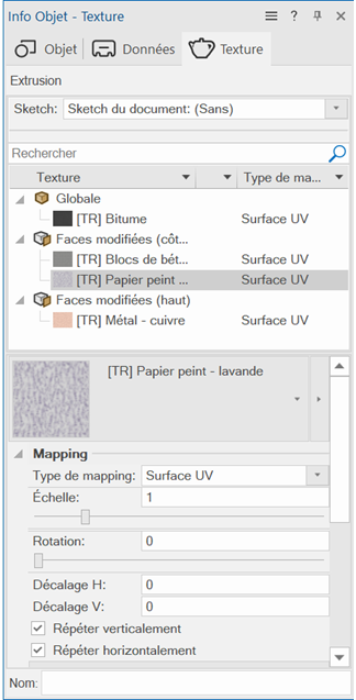 Pour la plupart des objets, vous devez appliquer les textures aux objets et aux faces individuelles (voir Appliquer des textures aux objets et aux faces à l’aide de l’outil Texture)) avant que les entités texturisables puissent apparaître dans l’onglet « Texture ». Cependant, ces entités apparaissent automatiquement pour les objets comme les murs, les planchers, les toitures et les surfaces pavées qui peuvent avoir des composants texturisables.