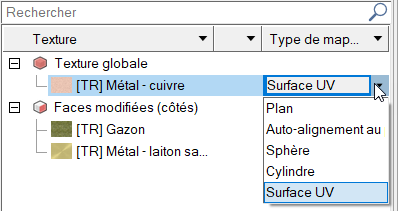 Les textures appliquées à l’objet apparaissent, divisées en groupes que vous pouvez déployer/réduire. Il est possible d’appliquer différentes textures (y compris des posters) aux différents composants, faces ou parties de la plupart des objets. Voir Textures des objets 3D et Utiliser des textures sur des objets avec des composants pour plus d’informations sur l’affichage des différents types d’objets et la façon de les éditer. Sélectionnez un élément dans la liste pour lui appliquer une autre texture ou pour mapper la texture sur cet élément. Lorsque plusieurs éléments sont sélectionnés, les mêmes changements de texture/mapping sont appliqués à tous les éléments sélectionnés. Un menu contextuel vous fournit des façons supplémentaires de gérer les éléments de la liste « Texture » (voir Commandes du menu contextuel de la liste « Texture »). Cliquez dans la colonne Type de mapping d’un élément et cliquez sur la flèche déroulante à droite du type actuel pour modifier le type de mapping pour cette entité (voir Concept: Projection et orientation des textures).