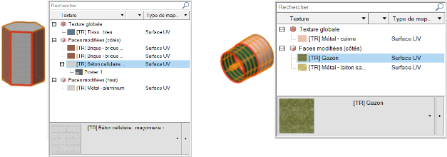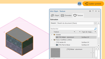 Cliquez sur un élément de la liste pour que les arêtes de cette face apparaissent en surbrillance dans le dessin et éditez la texture ou le mapping.