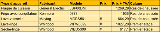 Dans cet exemple, la ligne 1 contient les intitulés des colonnes. L'en-tête de la base de données (ligne 2) est définie de façon à ce que le tableau reprenne tous les objets liés au format de base de données Appareils. Les sous-lignes 2.1 à 2.5 correspondent aux objets du dessin qui respectent ce critère.