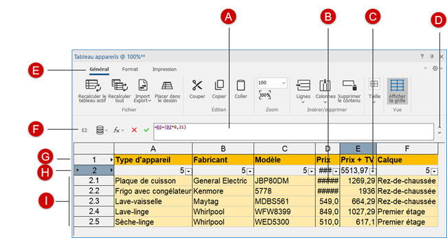 A : Champ « Formule » B : Augmentez la colonne pour voir ce nombre C : Cliquez pour ouvrir une liste déroulante et éditer le contenu des colonnes D : Cliquez pour afficher/masquer le champ de la formule E : Barre d’outils, avec des onglets F : Barre d'édition des formules G : Ligne de tableau simple H : En-tête base de donnée I : Sous-lignes |