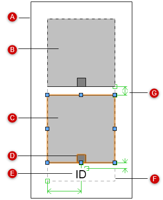 A: Celkader B: Plaatshouder voor tweede afbeelding C: Plaatshouder afbeelding (geselecteerd) D: Uitlijningsweergave E: Dynamisch tekstveld F: Begrenzingsvak van celinhoud G: Restrictie |