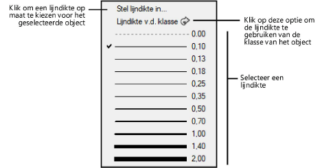 Wanneer je in het kenmerkenpalet op knop Lijndikte klikt, verschijnt er een keuzelijst waaruit je een aantal standaard lijndiktes kunt selecteren. Om de beschikbare lijndiktes in deze lijst te bewerken of te verwijderen, of lijndiktes op maat aan deze lijst toe te voegen, zie Lijndiktes op maat creëren.