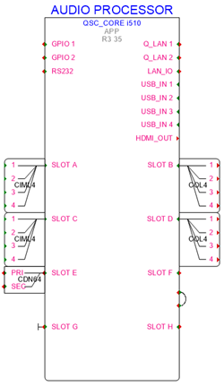 A socket is a port on a device through which a signal flows. Devices can incorporate any number of input (IN), output (OUT), or input/output (IO) sockets. Since signals typically flow from left to right, place input sockets on the left side of a device and output sockets on the right. Sockets can be named based on the type of connector and the signal they carry, or by a custom naming convention. While sockets can be placed on the top side of a device, that area is normally reserved for the device name label.