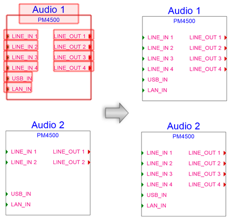 The parameters of the source device's sockets are copied to the target device sockets; the target device socket moves to the same location (relative to the device local origin) as the source device socket