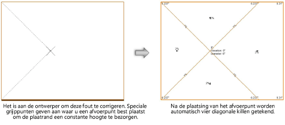 Wanneer je met de cursor over de plaat beweegt, verschijnen er speciale grijppunten. Aan de hand hiervan kan je afvoerpunten met een gelijke hoogte makkelijker plaatsen. Je hoeft het afvoerpunt niet perse op een grijppunt te plaatsen, maar als je dit doet voor een plaat zonder bestaande afvoerpunten, zullen de gevormde killen een gelijke hoogte hebben (ten minste voor de randen die vanuit de aangeduide hoeken vertrekken).