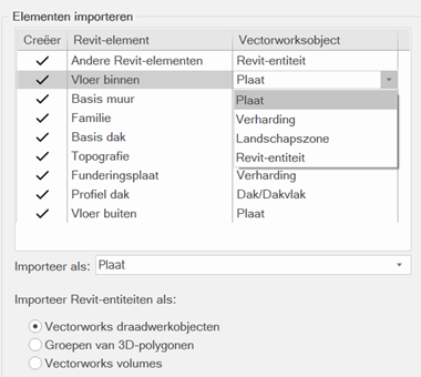 Voor Revitelementen die afhankelijk van de context als andere Vectorworksobjecttypes geïmporteerd moeten worden, kan je het gewenste objecttype selecteren; bijvoorbeeld, een Revit vloerobject kan geïmporteerd worden als een Vectorworks plaat, verharding of landschapszone.