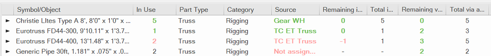 In this example, several types of truss in the Rigging category have been placed in the drawing. In the first row, five truss are available in inventory, and five have been placed. None remain for placement. In the second row, no more truss are available in the assigned inventory; however, others are available in other inventories. In the third row, one more truss has been placed than is available in the assigned inventory. Finally, the item in the last row has not yet been assigned to an inventory.