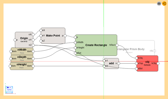 Geef de wrapperknoop een naam om in- en output van gegevens mogelijk te maken. In dit voorbeeld moet je toegang verschaffen tot het invoegpunt van het rechthoekige prisma, de objectafmetingen (breedte, diepte en hoogte) en de uiteindelijke extrusie.