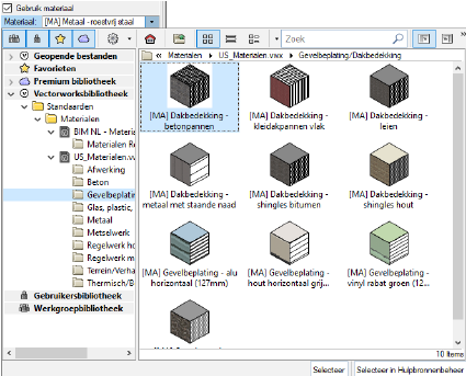 De miniaturen van materialen in het Hulpbronnenbeheer en de Hulpbronnenkiezer geven informatie die je kan helpen bij het selecteren van het juiste materiaal.