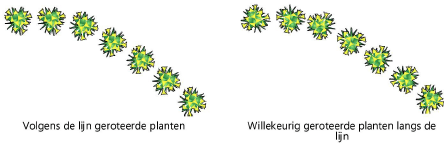 Stelt de horizontale afstand tussen planten in (Plant tussenruimte) en tussen verticale rijen van plantenseries (Raster rijafstand). Hetzelfde als plant spreiding: Stelt de Plant tussenruimte hetzelfde in als de instelling Spreiding. Vaste afstand: Selecteer deze optie om planten in te voegen volgens de opgegeven afstand. Optimaal passend: Zet een plant aan het begin en einde van elk pad en verdeelt de planten dan zo gelijkmatig mogelijk, zo dicht mogelijk bij de opgegeven afstand. Hierdoor heb je altijd een plant bij elk padcontrolepunt. Aantal planten: Selecteer deze optie om het opgegeven aantal planten gelijkmatig te verdelen langs elk lijnsegment of binnen de serie. Hetzelfde als plant tussenruimte: Zet de Raster rijafstand op hetzelfde in als de Plant tussenruimte die je hebt gekozen. |