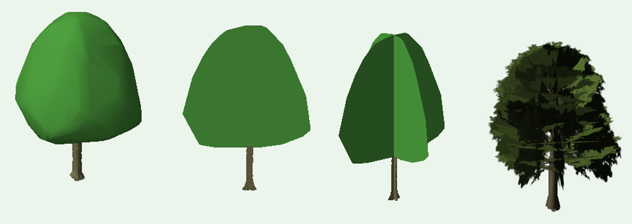 Selecteer de 3D weergave van de plant; hogere detailniveaus kunnen leiden tot tragere prestaties. Proxy: Creëert een 3D-model gebaseerd op de ruwe vorm van de plant. Symbool: Creëert een vorm die altijd naar de kijker georiënteerd is, gebaseerd op de dwarsdoorsnede van de plant. Gekruist symbool: Creëert de illusie van een vol object door twee dwarsdoorsnedes van de plant de plaatsen in een hoek van 90 graden ten opzichte van elkaar. Detail: Creëert een draadwerkobject van de plant met verschillende detailleringsniveaus. |