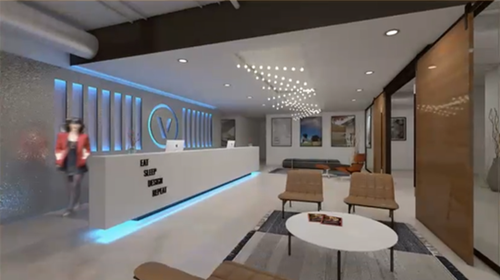 Het rendertype Realistisch (boven) en Realistisch RS rendertype (onder) leveren beide hoogwaardige renderingen van deze bedrijfsreceptie, maar ze interpreteren licht, reflecties en texturen verschillend