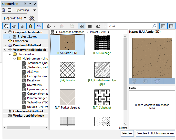 Selecteer de map en het bestand waarvan je de bijhorende hulpbronnen wilt downloaden of weergeven in de Hulpbronnenlijst. Enkel mappen die bruikbaar zijn voor de huidige taak worden weergegeven. Wanneer de Hulpbronnenkiezer bijvoorbeeld verschijnt terwijl je een lijnarcering uit het Kenmerkenpalet selecteert, worden hier alleen mappen met lijnarceringen weergegeven.