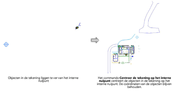 De hele tekening is gecentreerd op het interne nulpunt, waarbij alle objecten op alle ontwerplagen zijn verplaatst, inclusief vergrendelde en niet-zichtbare objecten. Alle zichtvensters op presentatielagen en bewaarde tekenzones worden automatisch aangepast. Omdat het gebruikersnulpunt eveneens wordt aangepast, blijven de coördinaten van het bestand intact.