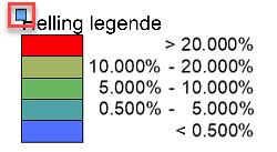 Een helling legende toont de gekleurde hellingen zoals gespecificeerd in het tabblad Terreinanalyse van de Grafische instellingen van het terreinmodel.
