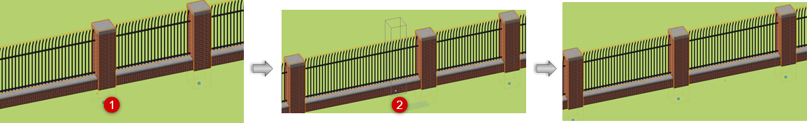 Wanneer het hek over een terreinmodel wordt geplaatst, past het zich automatisch aan aan veranderingen in de hoogte van het terreinmodel, wanneer Stuur naar terreinoppervlak is geselecteerd in de instellingen. Wanneer het geplaatst wordt over een 3D-bject, met de uitzondering van planten en terreinbewerkingsobjecten, moet de omheining opnieuw uitgelijnd worden als het niveau van het object veranderd of als je een omheinng gespiegeld hebt.