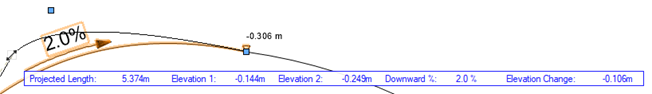 Wanneer je een handgreep verplaatst, toont de zwevende Gegevensbalk alle gekende en berekende parameters; deze worden bijgewerkt wanneer je het handgreep verplaatst, of je kunt in de zwevende Gegevensbalk tabben en specifieke waarden toekennen aan elke parameter (zie Tekenen m.b.v. de Coördinatenbalk). De gekende waarde toegewezen aan het geselecteerde handvat kan bewerkt worden, net als de berekende parameters. De gekende waarde die toegekend is aan de handgreep die niet bewerkt wordt, is meestal niet beschikbaar om te bewerken, tenzij een significante aanpassing van de helling een wijziging vereist. Berekeningen voor verbonden hellingen in een netwerk worden voorzichtiger behandeld dan individuele hellingen , om een onbedoelde kettingreactie door een volledig hellingnetwerk te vermijden. Voor verbonden hellingen krijgt slechts één van de peilen automatisch een nieuwe waarde en moet de helling worden bijgewerkt.