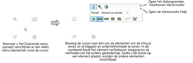 Bepaal bij de Vectorworksvoorkeur Weergave Zwevend menu welke vorm de elementen rond de cursor moeten aannemen wanneer je het Zwevende menu oproept: tekst, iconen, tekst en iconen, of volledig uitgeklapte sets en paletten.