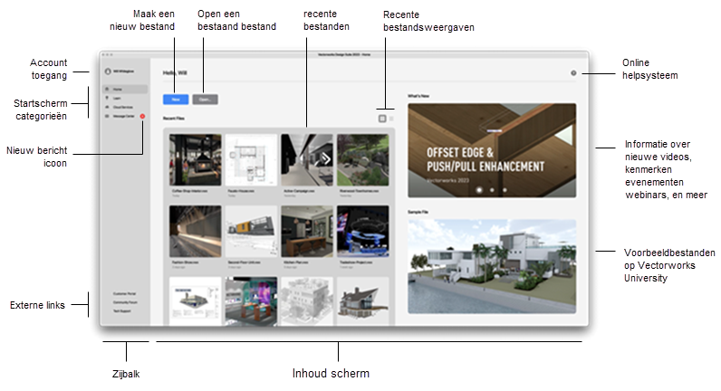 Het Startscherm is een toegangspunt naar verschillende bestanden, video’s en andere hulpbronnen om Vectorworks te leren kennen en te gebruiken. Je kan het startscherm gebruiken om bestanden te maken en te openen, en wanneer het startscherm actief is, zijn de Vectorworks menu's toegankelijk en gedragen ze zich zoals wanneer er geen bestand geopend is. Afhankelijk van je Vectorworks voorkeuren en hoe je het programma opstart, wordt het Startscherm al dan niet automatisch bij het opstarten geopend; zie Voorkeuren Vectorworks: Categorie Interface.