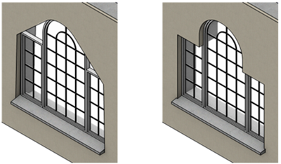 Als het symbool geen opening component heeft (links getoond), maakt de muur een opening die de 3D vorm volledig omvat. Met een opening component (zie rechts) maakt het symbool een gat met de juiste vorm.