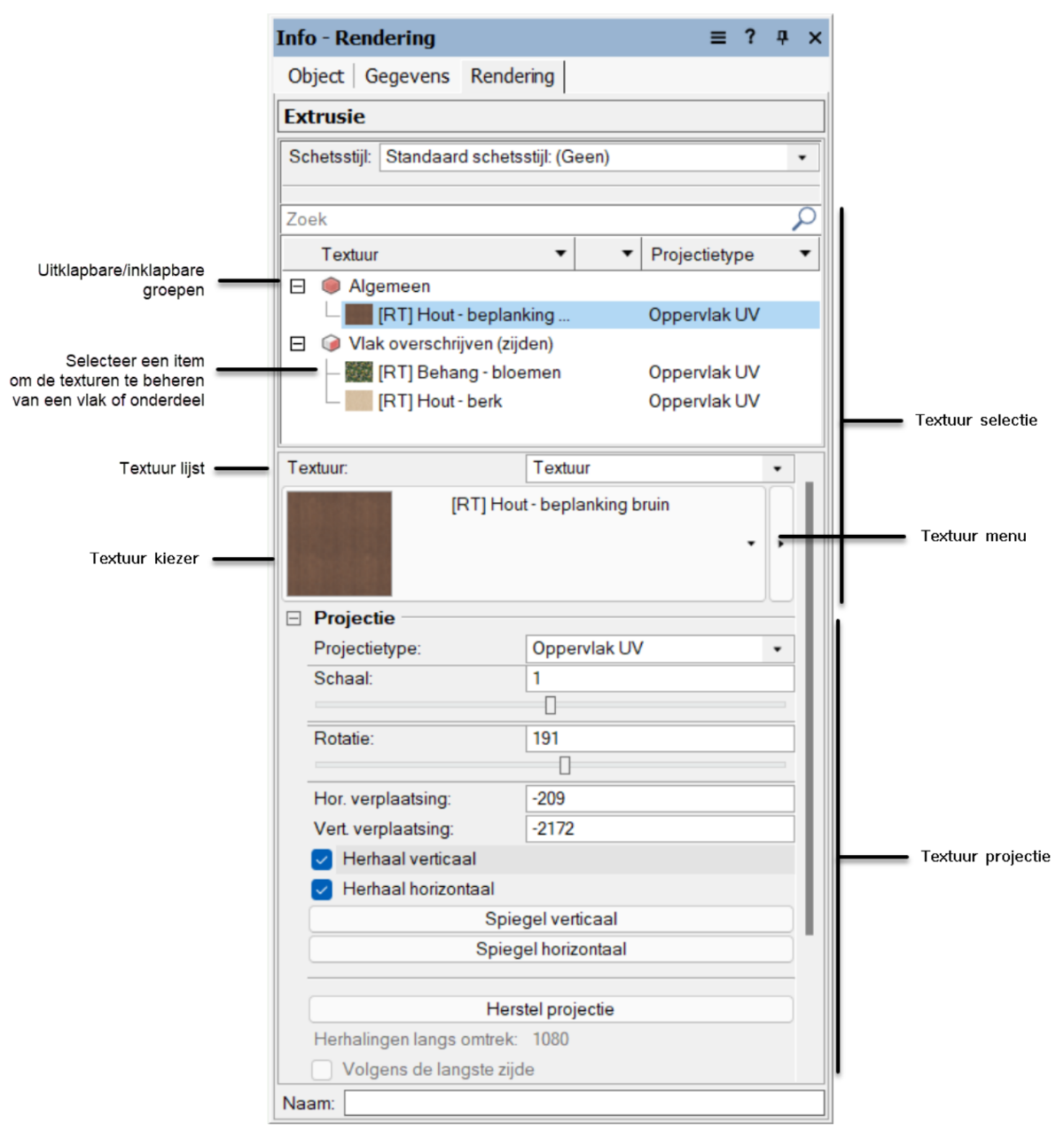 Bij de meeste objecten moet je eerst texturen toepassen op objecten of individuele vlakken (zie Texturen toepassen op objecten en vlakken met het gereedschap Textuur) opdat de betextureerbare onderdelen verschijnen in het tabblad Rendering. Bij objecten zoals muren, platen, daken en verhardingen worden de betextuureerbare componenten en onderdelen wél automatisch weergegeven.
