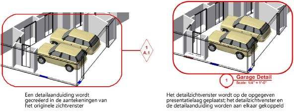 Het zichtvenster en diens detailaanduiding worden gekoppeld zodat je makkelijk tussen lagen kan wisselen. Verplaatst of vervorm je de aanduiding, dan verandert ook het detailzichtvenster. Je kan de detailaanduiding bovendien automatisch laten bijwerken wanneer je het detailzichtvenster opnieuw nummert of naar een andere laag verplaatst.