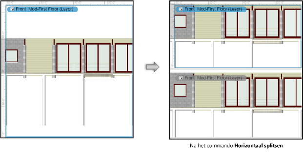 Het deelvenster wordt in twee vensters met dezelfde grootte gesplitst; door middel van de scheidingslijn kan je de deelvensters groter of kleiner maken. Aanvankelijk bevatten de twee deelvensters hetzelfde aanzicht en hebben ze dezelfde instellingen, maar na het splitsen kan je ze afzonderlijk wijzigen.