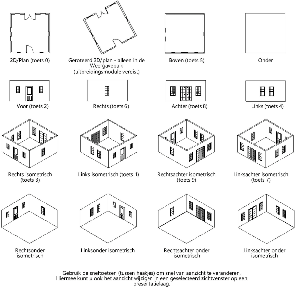 De sneltoetsen van het numerieke toetsenblok voor verschillende standaardweergaven worden hieronder weergegeven. Hiermee kan je ook het aanzicht wijzigen in een geselecteerd zichtvenster op een presentatielaag.