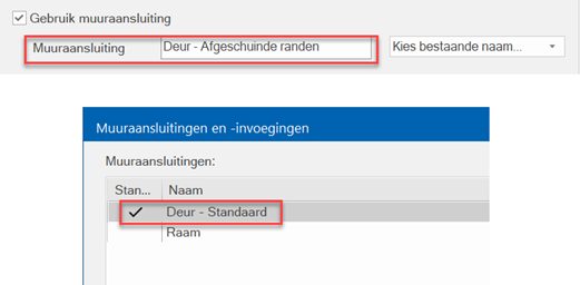 Wanneer het deurobject (boven) en de muurstijl (onder) dezelfde muuraansluing naam hebben, wordt de koppeling gemaakt; gepaste muuraansluiting instellingen worden automatisch toegepast op de muuropening rond deze deur.