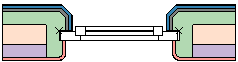De blauwe en grijze componenten aan de buitenzijde van de muur, en de rode component aan de binnenzijde zijn allemaal ingesteld op Tot aan ingevoegd object. De groene component loopt door tot aan de rode component, zonder een bepaalde afstand of een dikte op maat. Er zijn geen muur componenten ingesteld op Plooi om in dagkant. Het ingevoegde raamobject heeft een profiel afstand op de buitenkant in de categorie Profiel afstand, wat de muurinstellingen overschrijft.