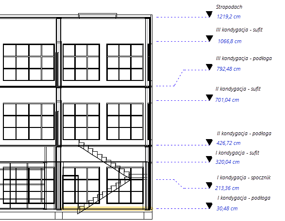 Jeśli w projekcie zdefiniowano kondygnacje (wymagana jest wersja branżowa Vectorworks Architect lub Vectorworks Landmark), można skojarzyć rzędną wysokościową z rzędną kondygnacji. Obiekty te można wstawiać, zarówno w warstwach projektowych, jak i w adnotacjach okien widoku. Zob. Rzędne wysokościowe a kondygnacje.
