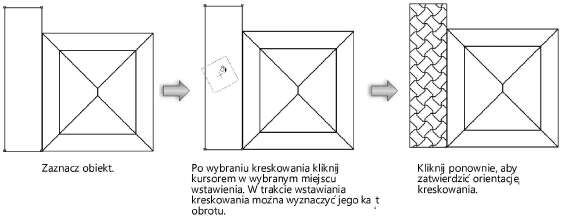 Dzieje się tak dlatego, że kreskowania te są grupami nieskojarzonymi z żadnym obiektem. Nie obracają się wraz z obiektem ani nie wykazują cech wypełnienia. W praktyce jest to grupa linii tylko przypominająca kreskowanie. Można je edytować albo jako grupę lub rozbić na poszczególne elementy za pomocą polecenia Rozdziel grupę. Aby kreskowanie nieskojarzone stało się elementem obiektu, należy je zgrupować z obiektem.