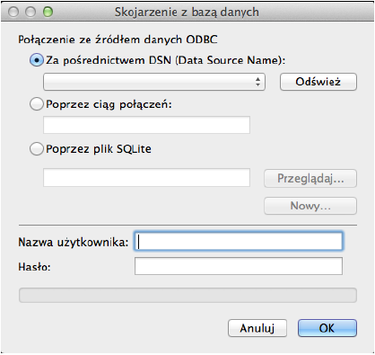 Zaznacz plik SQLite lub bazę danych dodaną w oknie Administratora źródeł danych ODBC lub Menadżera ODBC. Wpisz Nazwę użytkownika i Hasło (jeśli będzie to wymagane).