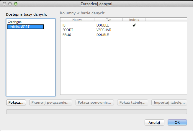 Zaznaczona baza danych zostanie dodana do listy dostępnych baz danych w oknie dialogowym Zarządzaj danymi. Tabele, które zostały skojarzone z wybraną bazą danych, pojawią się po lewej stronie, a kolumny z tych tabel po prawej stronie.