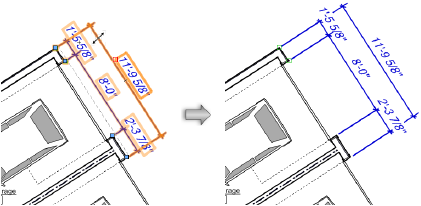 Gdy linia wymiarowa używa więcej wartości niestandardowych dla tych parametrów, każda linia pomocnicza otrzyma własną przerywaną linię, umożliwiającą jej edycję.