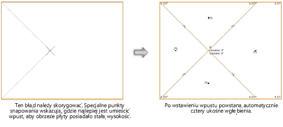 Może się zdarzyć, że wpust znajduje w takim miejscu, że żadna powierzchnia nie odprowadza wody w jego kierunku. Zadaniem projektanta jest odpowiednie skorygowanie wpustu. Jedyne, co na to wskazuje, to fakt, iż geometria płyty pozostała bez zmian po umieszczeniu wpustu.