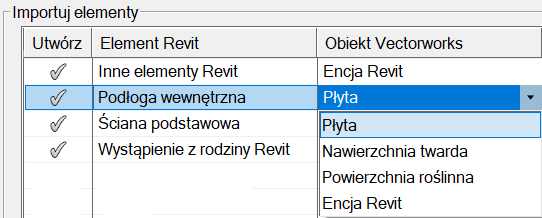 Ta lista wyświetla zestawienie obiektów Revit znajdujących się w importowanym pliku. Kliknij, aby wstawić znak wyboru (fajkę) w kolumnie Utwórz obok elementów, które mają zostać uwzględnione w imporcie. Należy zaznaczyć co najmniej jeden element. W przypadku każdego elementu przeznaczonego do zaimportowania kliknij kolumnę Obiekt Vectorworks, a następnie strzałkę służącą do rozwijania listy wyboru widoczną po prawej stronie bieżącego typu obiektu, aby wybrać inny typ obiektu dla tego elementu. Do wyboru dostępne są tylko te typy obiektów Vectorworks, które stanowią właściwe odpowiedniki dla importowanego obiektu z programu Revit.