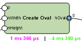 Jeśli w oknie dialogowym „Ustawienia Marionette” opcja Pokaż czas wykonania (tylko w trybie Debuguj) jest zaznaczona, w tekście poniżej każdego węzła znajdującego się w sieci wyświetli się czas, jak potrzebny był do wykonywania tego węzła podczas wykonywania skryptu. W przypadku węzłów, które oprócz portów wejściowych obsługują także inne porty, wyświetlany jest także łączy czas, jaki upłynął od początku sieci.