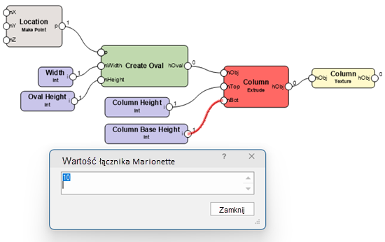 Zastosuj tryb Debuguj dostępny w narzędziu Marionette, aby wykryć błędy w sieciach, gdy nie funkcjonują one w zamierzony sposób. Operację debugowania możesz wykonać na niewypakowanym skrypcie. Możesz też kliknąć dwukrotnie węzeł konsolidujący lub węzeł obiektu, aby debugowaniu poddać jego skrypt. Gdy tryb Debuguj jest włączony, obok każdego portu wyjściowego pojawi się liczba oznaczająca liczbę wartości przepływających z portu wyjściowego do wszelkich dołączonych portów wejściowych. Klikając łącznik, otworzysz okno dialogowe „Wartość łącznika Marionette”, w którym wyświetlane są wszystkie wartości przesyłane tym łącznikiem. Skrypt zostanie wykonany po zamknięciu okna.
