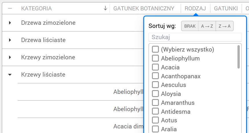 Kliknij nagłówek kolumny, aby otworzyć okno sortowania i filtrowania w celu ułatwienia wyboru. Aby posortować elementy w ramach kategorii, wybierz opcję sortowania; jeśli lista jest posortowana według kolumny, w nagłówku kolumny pojawi się strzałka. Aby przefiltrować listę roślin, umieść znacznik wyboru obok wartości parametrów do uwzględnienia; aby przefiltrować listę, wprowadź tekst w polu wyszukiwania.