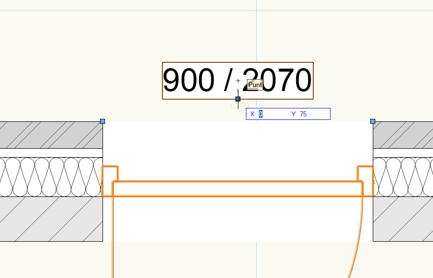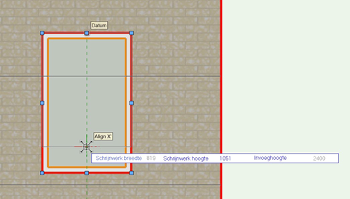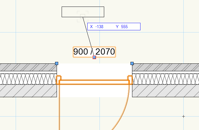 Parametry takie jak: szerokość, wysokość i wysokość wstawienia poszczególnych okien i drzwi można dostosować bezpośrednio na rysunku za pomocą punktów kontrolnych znajdujących się na lewej i prawej krawędzi oraz w narożach obiektu. Można również użyć dwóch linii odniesienia, które znajdują się na stałej wysokości 80 cm i 215 cm.