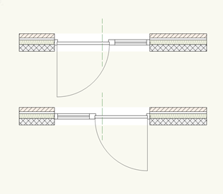 Okna i drzwi wstawione do rysunku za pomocą narzędzia Okno lub drzwi wewnętrzne lub Okno lub drzwi zewnętrzne można wyświetlić w odbiciu lustrzanym na kilka różnych sposobów; jeszcze przed wstawieniem w ścianę i po wstawieniu w ścianę:
