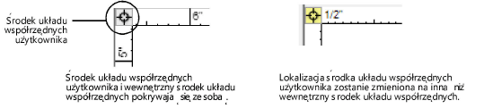 Do zmiany położenia środka układu współrzędnych użytkownika w ujęciu widoku możesz użyć polecenia Środek układu współrzędnych użytkownika lub przycisku Środek układu współrzędnych użytkownika. W nowym pustym dokumencie środek układu współrzędnych użytkownika i wewnętrzny środek układu współrzędnych użytkownika pokrywają się w miejscu przecięcia osi X i Y (0,0). W niektórych przypadkach konieczne jest przesunięcie środka układu współrzędnych użytkownika względem wewnętrznego środka układu współrzędnych. Współrzędne rysunku wyświetlane są w odniesieniu do środka układu współrzędnych użytkownika.