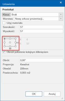 W przypadku niektórych obiektów, jeśli opcja definiująca położenie kolejnym kliknięciem nie jest zaznaczona i okno ustawień zawiera współrzędne X, Y i (opcjonalnie) Z, obiekt zostanie wstawiony automatycznie we wskazanej lokalizacji zaraz po kliknięciu OK.