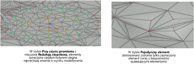 Włącz tę ikonkę, aby zastosować redukcję stopniową. Ta funkcja najbardziej wpływa na punkty kontrolne w środku zaznaczenia, przy stopniowej redukcji efektu (zgodnie z parametrem Redukcja), co gwarantuje naturalne, zaokrąglone efekty modelowania. Gdy włączysz tryb Redukcja stopniowa, wartość redukcji, a tym samym stopień rzeźbienia powierzchni, jest rozpoznawalny dzięki kolorowym punktom kontrolnym. Kolor czerwony oznacza, że efekt rzeźbienia jest najbardziej intensywny na tej części powierzchni. Kolor niebieski za to oznacza, że efekt modelowania jest słabszy, a elementy nie będą się łatwo przesuwać. Gdy wyłączysz tryb Redukcja stopniowa, wszystkie punkty kontrolne w obrębie promienia zostaną poddane operacji rzeźbienia w równym stopniu. W związku z tym wszystkie punkty kontrolne są wyświetlane na czerwono. |