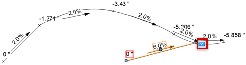 Narzędzie Nachylenie w trybie Punkt kontrolny pozwala wstawić serię połączonych ze sobą nachyleń prowadzonych wzdłuż linii prostej lub krzywej. W trybie Wzdłuż linii narzędzie Nachylenie umożliwia utworzenie pojedynczego nachylenia wzdłuż linii, które może stać się częścią sieci nachyleń, gdy zostanie z nimi połączone.