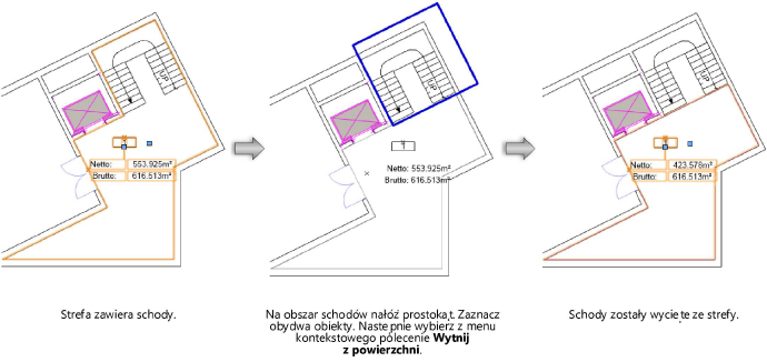 Możesz dostosować obrys strefy za pomocą modyfikatorów 2D. Wstaw do strefy zamknięty kształt 2D (np. prostokąt lub polilinię). Zaznacz obydwa obiekty, a następnie kliknij zaznaczenie prawym przyciskiem myszy, aby wywołać menu kontekstowe. Następnie wybierz z menu kontekstowego polecenie Scal powierzchnie lub Wytnij z powierzchni. Po wykonaniu operacji strefa wyodrębniona automatycznie na podstawie ścian w dalszym ciągu pozostanie z nimi powiązana.
