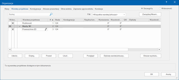 Kliknij ten przycisk, aby otworzyć okno dialogowe umożliwiające dodawanie, edycję, usuwanie i importowanie filtrów mających zastosowanie do listy warstw/arkuszy; zob. Filtrowanie i etykietowanie klas oraz warstw/arkuszy