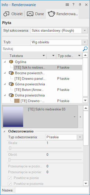 Tekstury przegrody strukturalnej zależą od ustawień słupów, rygli i paneli. Nie można ich modyfikować w zakładce Renderowanie.